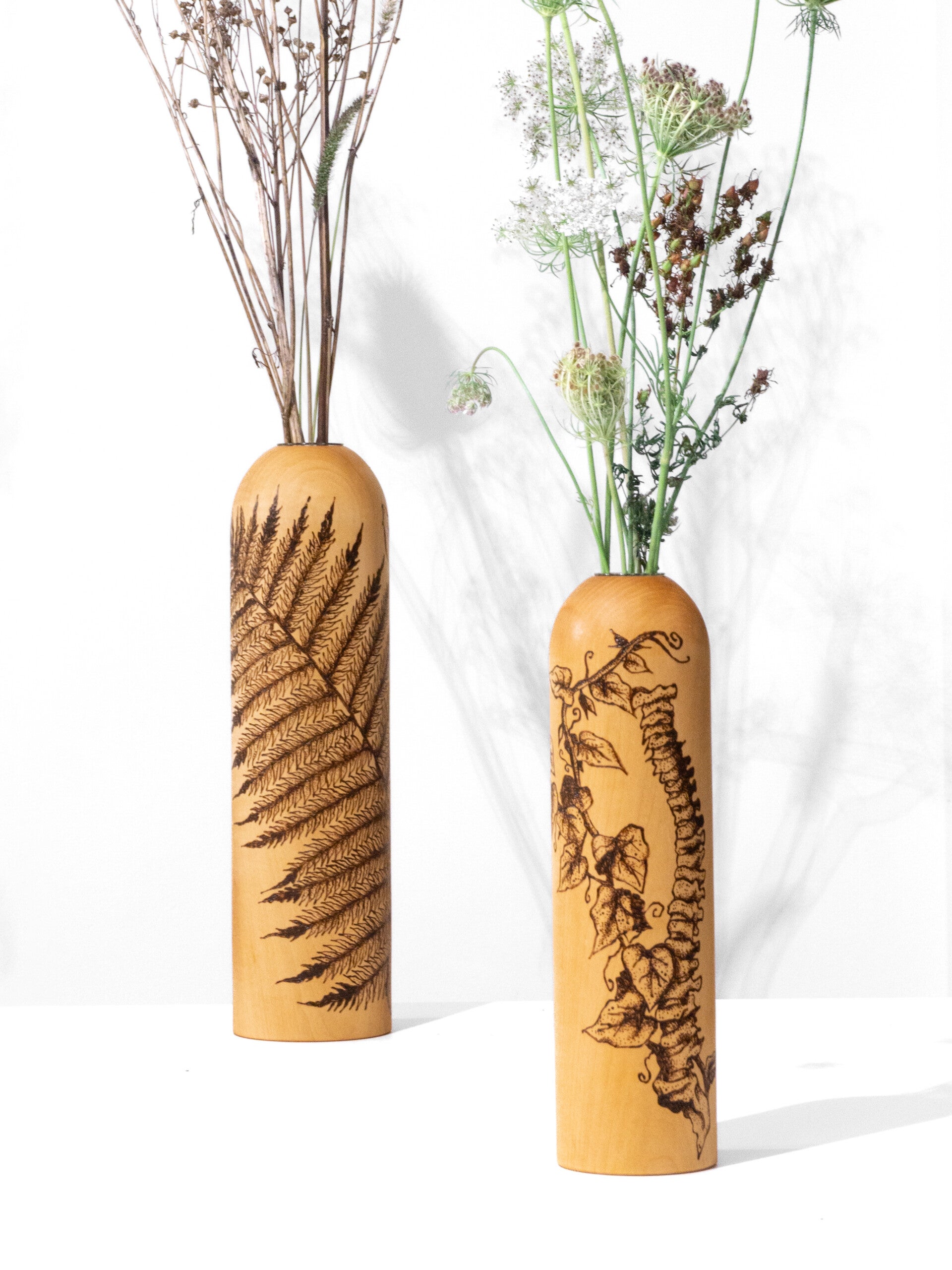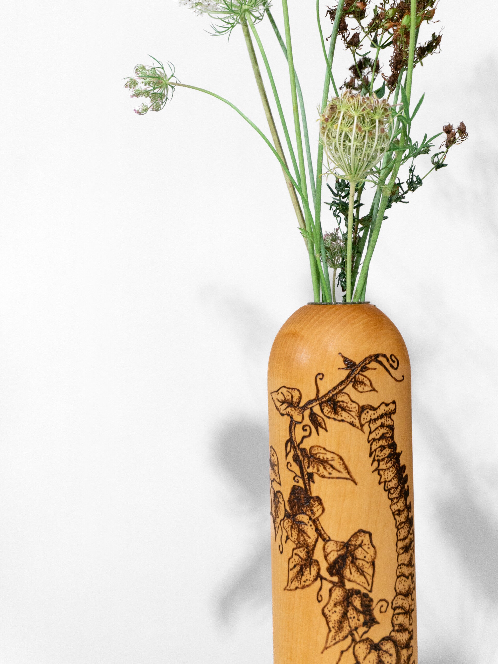 Linde | aus Restholz | mit handgebrannten Sujets von der Künstlerin Sara Sostini | geölt | Unikate | mit Reagenzglas | als Duo oder einzeln erhältlich